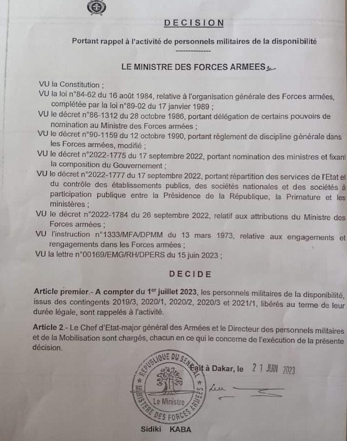 "A compter du 1er juillet 2023, les personnels militaires de la disponibilité, issus des contingents 2019/3, 2020/1, 2020/2, 2020/3 et 2021/1, libérés au terme de leur durée légale, sont rappelés à l'activité", informe une note prise par le ministre des Forces armée, Me Sidiki Kaba.