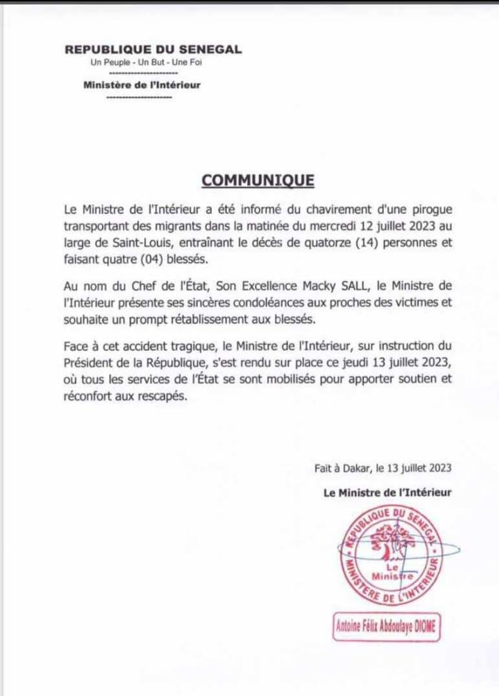 «Le Ministre de l'Intérieur a été informé du chavirement d'une pirogue transportant des migrants dans la matinée du mercredi 12 juillet 2023 au large de Saint-Louis, entraînant le décès de quatorze (14) personnes et faisant quatre (04) blessés», lit-on dans le texte de Antoine Félix Diome, qui présente ses condoléances aux familles des victimes.