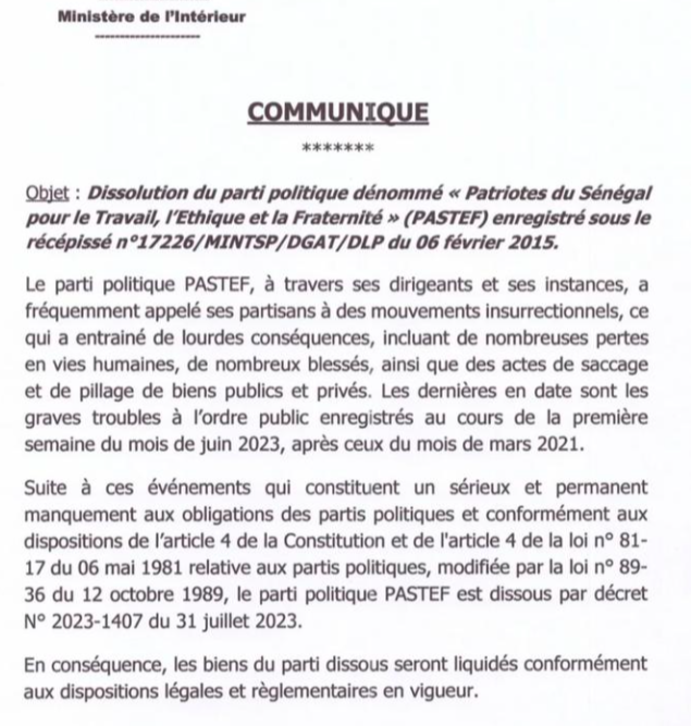 Le parti les Patriotes du Sénégal pour le travail, l’éthique et la fraternité (PASTEF) a été officiellement dissous ce lundi par décret, a annoncé le ministre de l’Intérieur, Antoine Félix Abdoulaye Diome. « (…) le parti politique Pastef est dissous par décret n° 2023-1407 du 31 juillet 2023 », écrit-il dans un communiqué.
