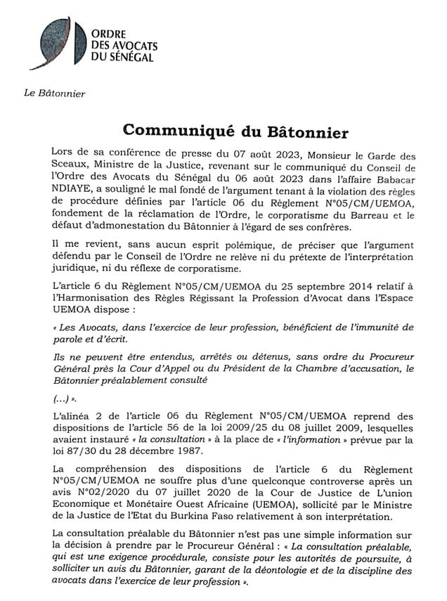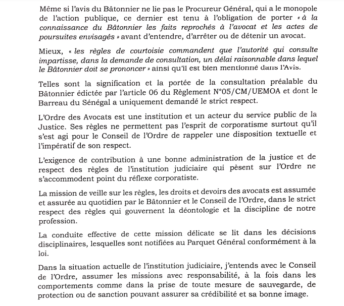 DOCUMENT - L'Ordre des avocats répond à Ismaila Madior Fall