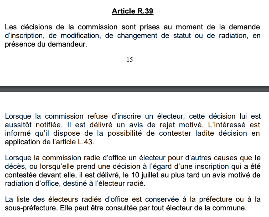 En son article R-97, le code électoral dispose que la commission retranche de la liste électorale, les électeurs "dont la radiation a été ordonnée par l’autorité compétente ou qui ont perdu les qualités requises par la loi". Il dispose aussi en son article R-39 que lorsque la commission radie d’office un électeur pour d’autres causes que le décès, ou lorsqu’elle prend une décision à l’égard d’une inscription qui a été contestée devant elle, il est délivré, le 10 juillet au plus tard, un avis motivé de radiation d’office, destiné à l’électeur radié.