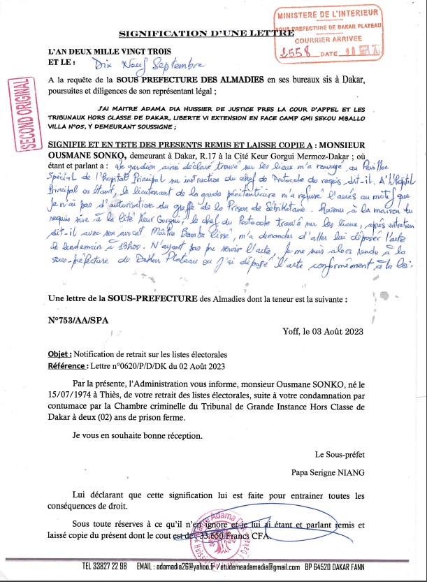 NETTALI.COM - Le dernier acte pour qu’Ousmane Sonko ne participe pas à la présidentielle de 2024. En effet, l’acte de signification de la décision de radiation des listes électorales a été déposé par un huissier de justice à la sous-préfecture de Grand-Dakar, faute d’avoir pu le donner directement à l’intéressé.