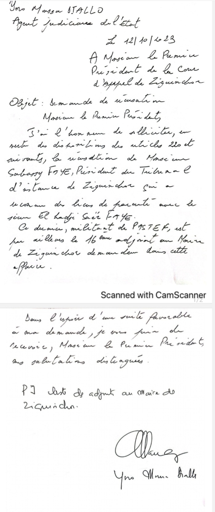 « J’ai l’honneur de solliciter en vertu des dispositions des articles 220 et suivants la récusation de Me Sabassy Faye, Président du tribunal d’instance de Ziguinchor, qui a reconnu les liens de parenté avec le sieur El Hadj Saër Faye. Ce dernier militant de Pastef est par ailleurs 16e adjoint au maire demandeur dans cette affaire.