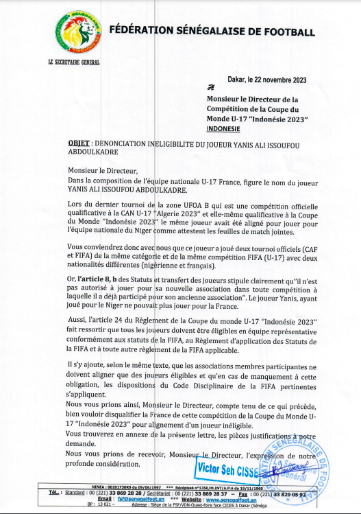 "Dans la composition de l’équipe nationale U17 France, figure le nom du joueur Yanis Ali Issoufou Abdoulkhadre. Lors du dernier tournoi de la Zone UFOA B, qui est une compétition officielle qualificative à la CAN U-17 "Algérie 2023" et elle-même qualificative à la Coupe du monde "Indonésie 2023", le même joueur avait été aligné pour jouer pour l'équipe nationale du Niger, comme attestent les feuilles de match jointes. Vous conviendrez donc avec nous que ce joueur a joué deux tournois officiels (CAF et FIFA) de la même catégorie et de la même compétition FIFA (U17) avec deux nationalités différentes (nigérienne et française). L'article 8 b des Statuts et transfert des joueurs stipule clairement qu’‘il n'est pas autorisé à jouer pour sa nouvelle association dans toute compétition à laquelle il a déjà participé pour son ancienne association. Le joueur Yanis, ayant joué pour le Niger ne pouvait plus jouer pour la France", note la Fédération sénégalaise de Football.