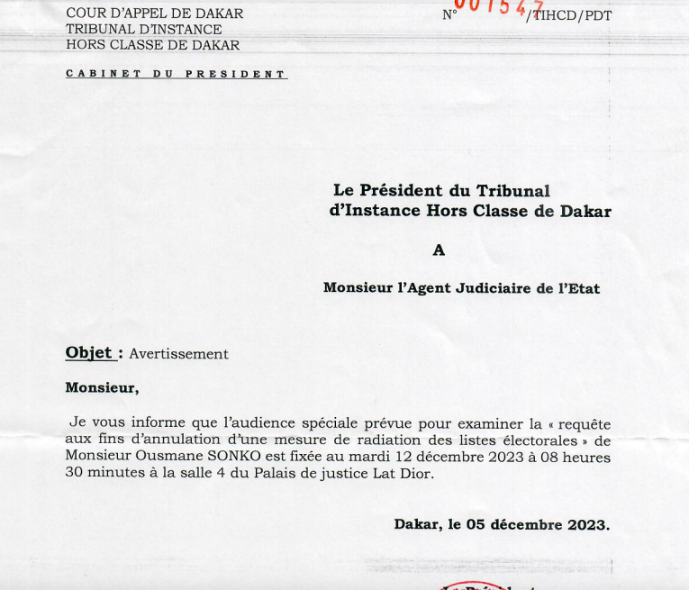 NETTALI.COM - Le président du tribunal d'instance hors classe de Dakar, Ousmane Racine Thione, vient de fixer la date de l'audience spéciale aux fins d'annulation de la mesure de radiation des listes électorales d'Ousmane Sonko. La date du mardi 12 décembre 2023 a été retenue pour la tenue de l'audience.