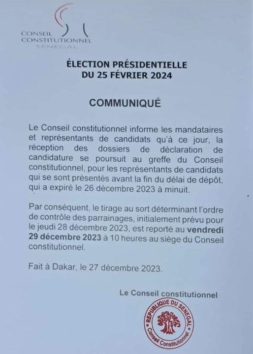 NETTALI.COM - Le tirage au sort déterminant l'ordre de passage et le calendrier du contrôle des parrainages, initialement prévu demain 28 Décembre, est reporté au vendredi 29 à 10h au siège du Conseil Constitutionnel. Le conseil constitutionnel a remis à tous les mandataires des candidats leurs convocations.