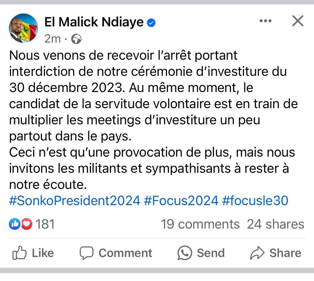 "Nous venons de recevoir l’arrêt (sic : arrêté plutôt) portant interdiction de notre cérémonie d’investiture du 30 décembre 2023. Au même moment, le candidat de la servitude volontaire est en train de multiplier les meetings d’investiture un peu partout dans le pays", a posté El Hadji Malick Ndiaye.