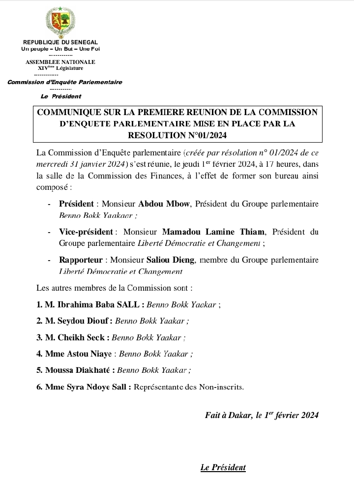 La Commission d’Enquête parlementaire (créée par résolution n° 01/2024 de ce mercredi 31 janvier 2024) s’est réunie, le jeudi 1er février 2024, à 17 heures, dans la salle de la Commission des Finances, à l’effet de former son bureau ainsi