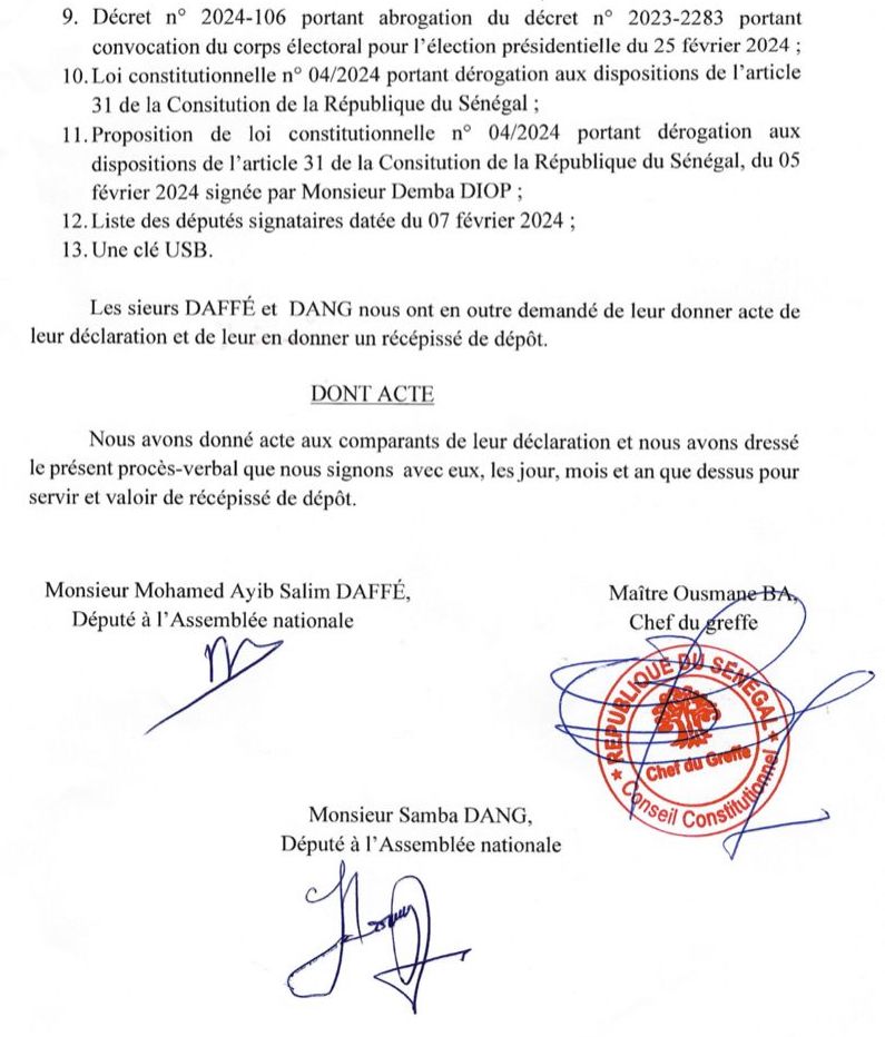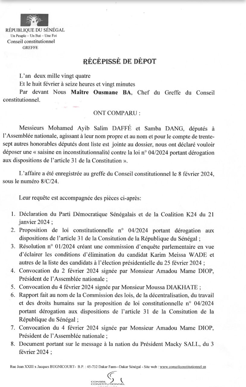 NETTALI.COM - Les députés membres du groupe parlementaire Yewwi Askan Wi ont saisi ce jeudi le Conseil Constitutionnel pour contester la loi constitutionnelle qui reporte l’élection présidentielle au 15 décembre 2024. En effet, la saisine en inconstitutionnalité contre la loi numéro 04/2024 portant dérogation aux dispositions de l’Article 31 de la Constitution a été déposés au niveau du Conseil par les députés Ayib Daffé et Samba Dang ce jeudi.
