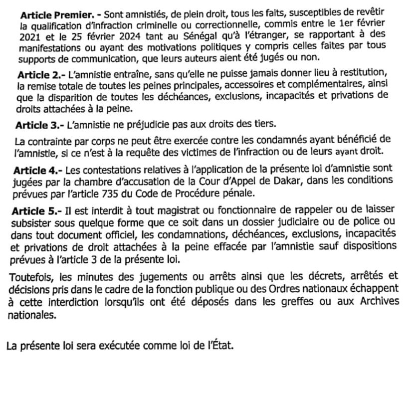 Et dès l'article premier, on apprend que "sont amnistiés, de plein droit, tous les faits susceptibles de revêtir la qualification d'infraction criminelle ou correctionnelle, commis entre le 1er février 2021 et le 25 février 2024, tant au Sénégal qu'à l'étranger, se rapportant à des manifestations ou ayant des motivations politiques y compris celles faites par tous les supports de communication, que leurs auteurs aient été jugés ou non".