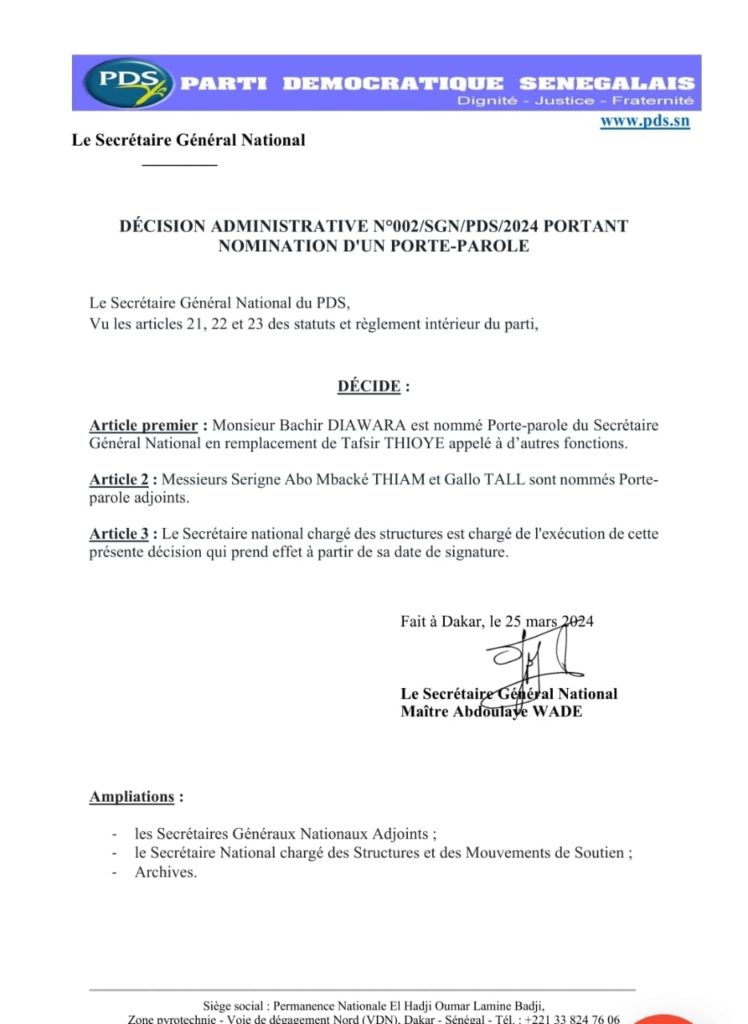 Se basant sur les articles 21, 22 et 23 des statuts et règlement intérieur du Parti démocratique sénégalais (Pds), le Secrétaire général national, Me Abdoulaye Wade, a décidé de nommer Bachir Diawara, Porte-parole du Secrétaire général national, en remplacement de Tafsir Thioye, appelé à d’autres fonctions. Dans la foulée, Serigne Abo Mbacké Thiam, député à l’Assemblée nationale, et Gallo Tall sont nommés Porte-parole adjoints.