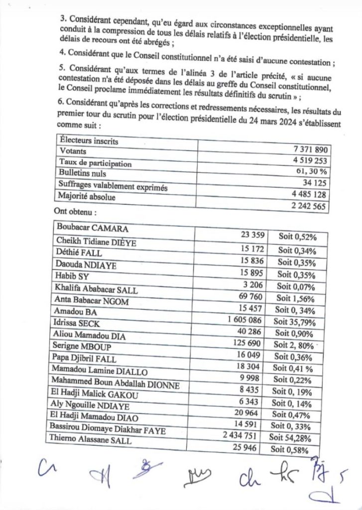NETTALI.COM - Après les résultats provisoires donnés par la commission nationale de recensement des votes logée à la Cour d'appel de Dakar, le Conseil constitutionnel vient de proclamer les résultats définitifs de l'election présidentielle qui s'est tenue le dimanche 24 mars dernier. Des résultats qui confirment l'élection de Bassirou Diomaye Faye dès le premier tour.
