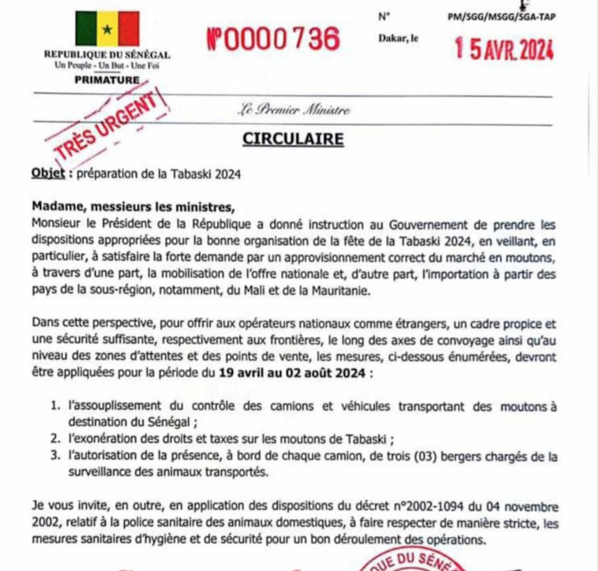 "Madame, messieurs les ministres, Monsieur le Président de la République a donné instruction au Gouvernement de prendre les dispositions appropriées pour la bonne organisation de la fête de la Tabaski 2024, en veillant, en particulier, à satisfaire la forte demande par un approvisionnement correct du marché en moutons, à travers d'une part, la mobilisation de l'offre nationale et, d'autre part, l'importation à partir des pays de la sous-région, notamment, du Mali et de la Mauritanie", écrit Ousmane Sonko dans sa missive.