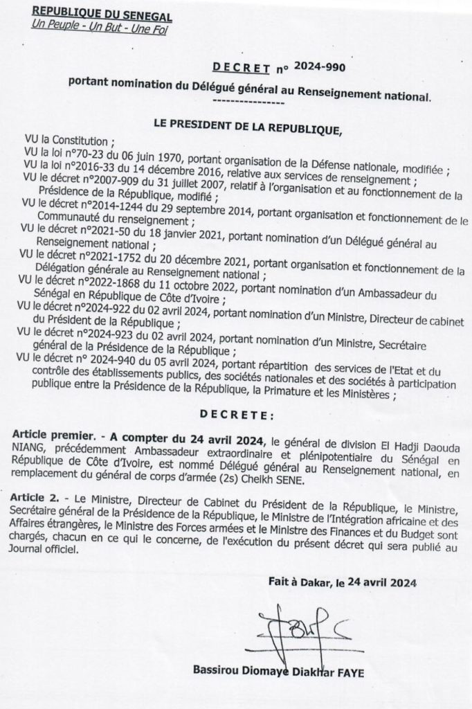 NETTALI.COM - Le président de la République, Bassirou Diomaye Faye, a procédé au remplacement du patron des renseignement. En effet, par décret en date du 24 avril 2024, le Président de la République Bassirou Diomaye Faye a, en effet, nommé le Général de division El Hadji Daouda Niang, nouveau délégué général au Renseignement national.