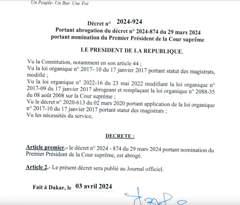 NETTALI.COM - Le président de la République, Bassirou Diomaye Faye, avait pris, dès sa prise de fonction, la décision d'abroger les décrets pris le 29 mars 2024 par Macky Sall, à l’issue de la dernière réunion du Conseil supérieur de la magistrature. Le décret pris à cet effet a été rendu public.