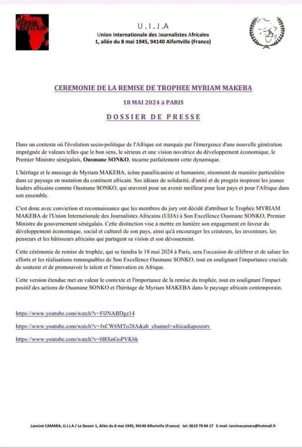 NETTALI.COM - Le trophée Myriam Makéba est décerné au leader du parti Pastef-Les patriotes. En effet, Ousmane Sonko est honoré par l’Union Internationale des Journalistes Africains (UIJA) pour son engagement en faveur du développement économique, social et culturel de son pays, son action à la faveur des créateurs, des inventeurs, des penseurs et des bâtisseurs africains qui partagent sa vision et son dévouement. La cérémonie aura lieu le 18 Mai 2024 à Paris.
