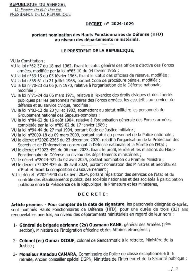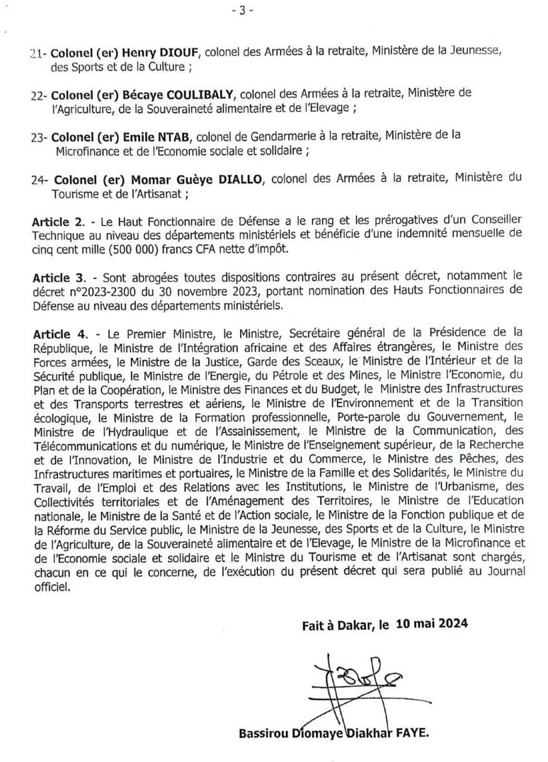 Ces postes ont été réactivés, le 6 mars 2023, par le président Macky Sall, mais ils n'ont été pourvus que le 30 novembre 2023. Le prédécesseur de Bassirou Diomaye Faye avait, à cet effet, nommé 33 Haut fonctionnaires de défense qui répondaient aux critères "d'éligibilité" prévus par le décret d'application, à savoir :