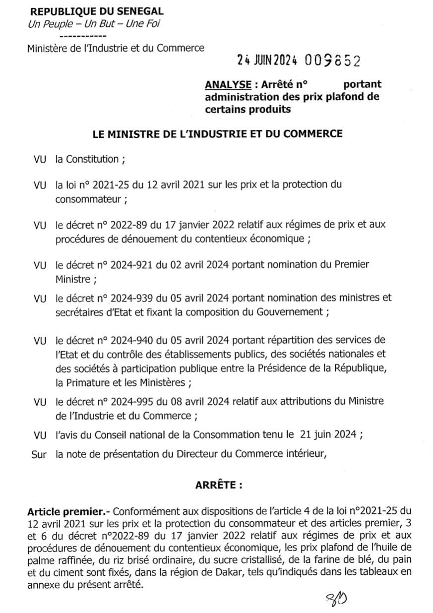 NETTALI.COM - Officiel. Le gouvernement vient de publier l’arrêté portant administration des prix plafond de certains produits. Le ministre du Commerce, Serigne Guèye Diop, a signé et publié l’arrêté portant administration des prix plafond de certains produits. Un acte qui devra officialiser les baisses des prix annoncée par l’Etat.