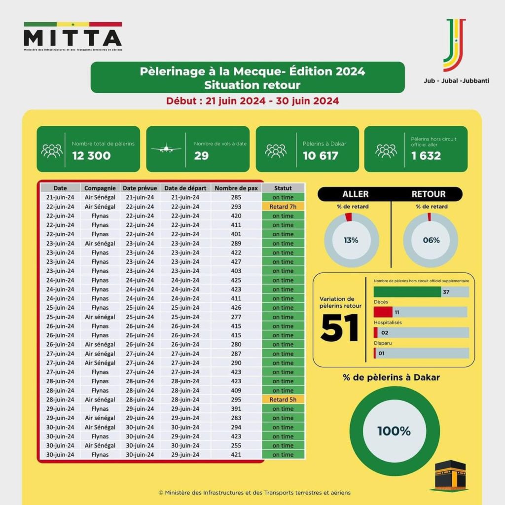 NETTALI.COM - Le Hajj 2024 s’est globalement bien déroulé malgré quelques retards initiaux. Le ministre El Malick Ndiaye et ses équipes, en collaboration avec le Ministre en charge des Affaires étrangères et ses équipes, ont réussi à surmonter les défis logistiques. Voici les chiffres clés de la phase retour du Hajj 2024 :