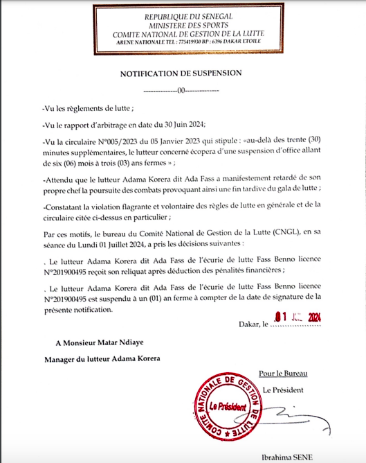 "Attendu que le lutteur Adama Korera dit Ada Fass a manifestement retardé de son propre chef la poursuite des combats, provoquant une fin tardive du gala de lutte ; Constatant la violation flagrante et volontaire des règles de lutte en général et de la circulaire citée ci-dessus en particulier ; par ces motifs, le bureau du Comité National de Gestion de la Lutte (CNGL), en sa séance du lundi 01 Juillet 2024, a pris les décisions suivantes : le lutteur reçoit son reliquat après déduction des pénalités financières, le lutteur est suspendu à un (01) an ferme à compter de la date de signature de la présente correspondance", a fait savoir le Comité National de Gestion de la Lutte (CNG).