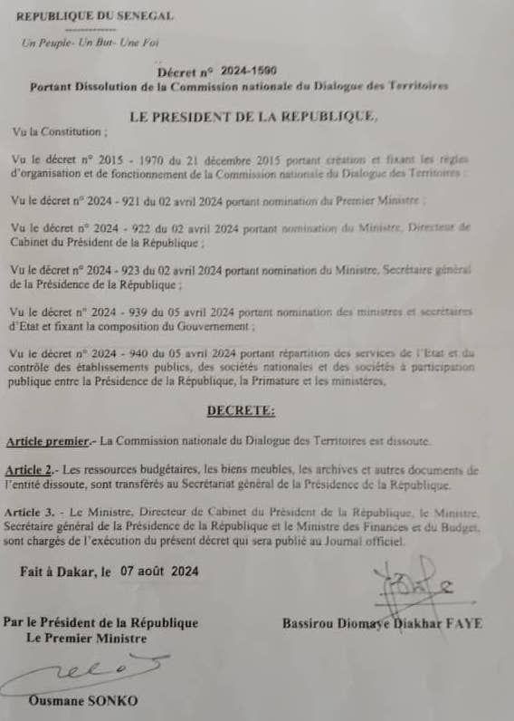 NETTALI.COM - Le Président de la République, Bassirou Diomaye Diakhar Faye, a déjà dissout la Commission nationale du dialogue des territoires. Il a signé un décret dans ce sens le 07 août dernier.