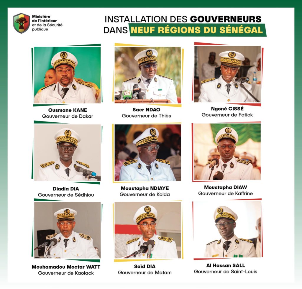 Les gouverneurs de Dakar, Ousmane KANE, Thiès, Saër NDAO, Fatick, Ngoné CISSÉ, Sédhiou, Diadia DIA, Kolda, Moustapha NDIAYE, Kaffrine, Moustapha DIAW, Kaolack, Mouhamadou Moctar WATT, Matam, Saïd DIA et Saint-Louis, Al Hassan SALL, ont été installés par le ministre de l'Intérieur, le Général Jean-Baptiste TINE.