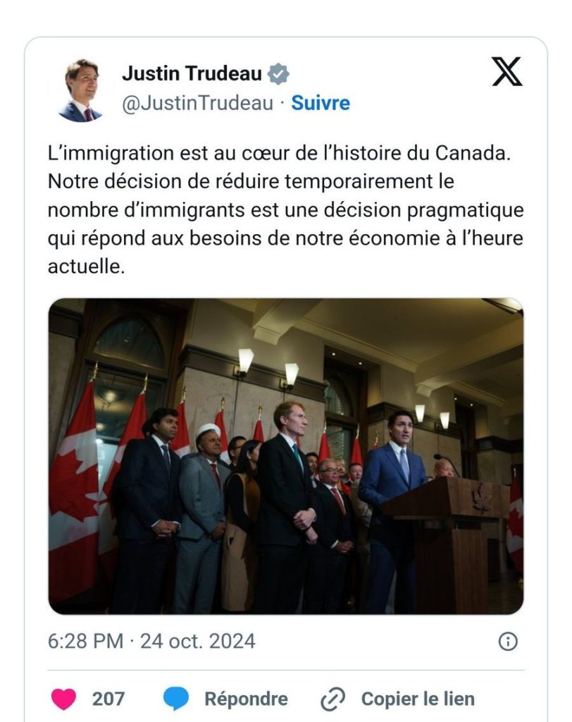 NETTALI.COM - Le Premier ministre canadien, Justin Trudeau, a annoncé sur X une réduction de 21 % du quota de résidents permanents dès 2025.
