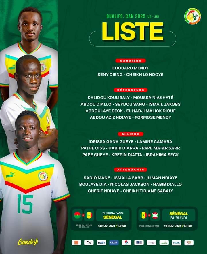 Le 14 puis le 19 novembre, l'équipe nationale du Sénégal jouera respectivement face au Burkina Faso et face au Burundi. Pour ces deux rencontres comptant pour les éliminatoires de la CAN 2025 et la bataille pour la première place du groupe, Pape Thiaw a dévoilé une liste de 28 joueurs.