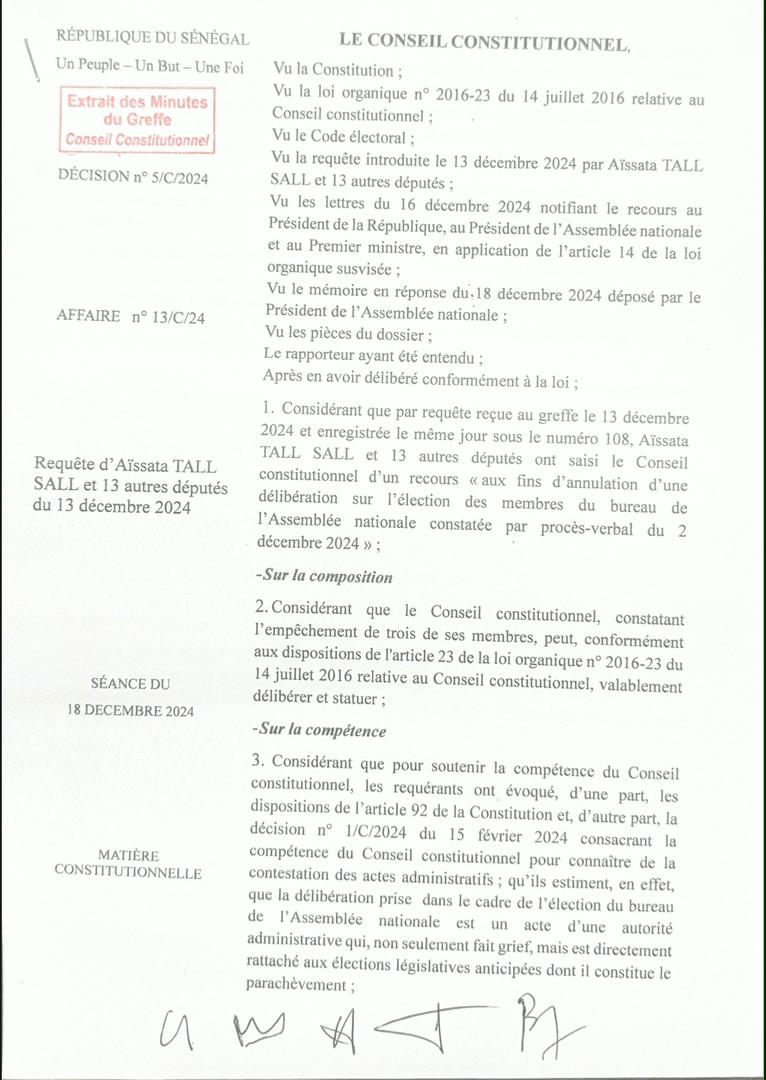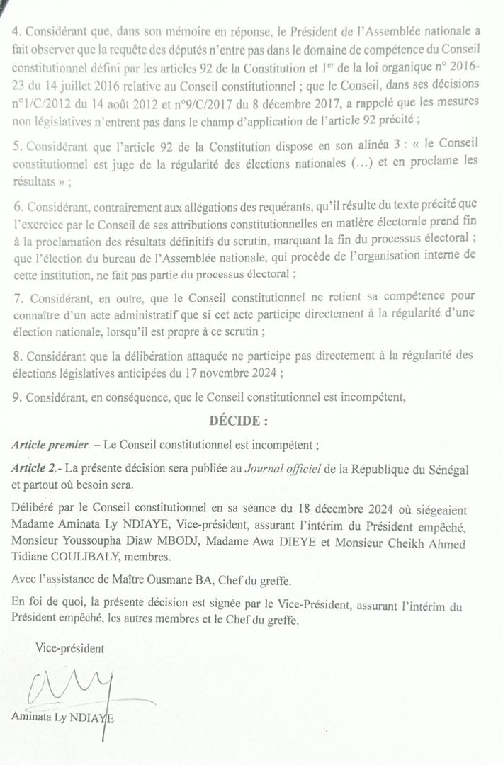 C'est donc pour cette raison que Me Aïssata Tall Sall et 13 autres députés avaient saisi le Conseil constitutionnel contre ce qu'ils ont qualifié de violation de leurs droits par le président de l'Assemblée nationale. Un recours donc "aux fins d'annulation d'une délibération sur l'élection des membres du bureau de l'Assemblée nationale constatée du 2 décembre 2024". Et ce mercredi, les 7 Sages ont donné leur verdict. Le Conseil constitutionnel a décidé de se déclarer incompétent. Autrement dit, El Malick Ndiaye obtient gain de cause et le bureau de l’Assemblée va pouvoir poursuivre ses travaux conformément au règlement intérieur de l'institution.