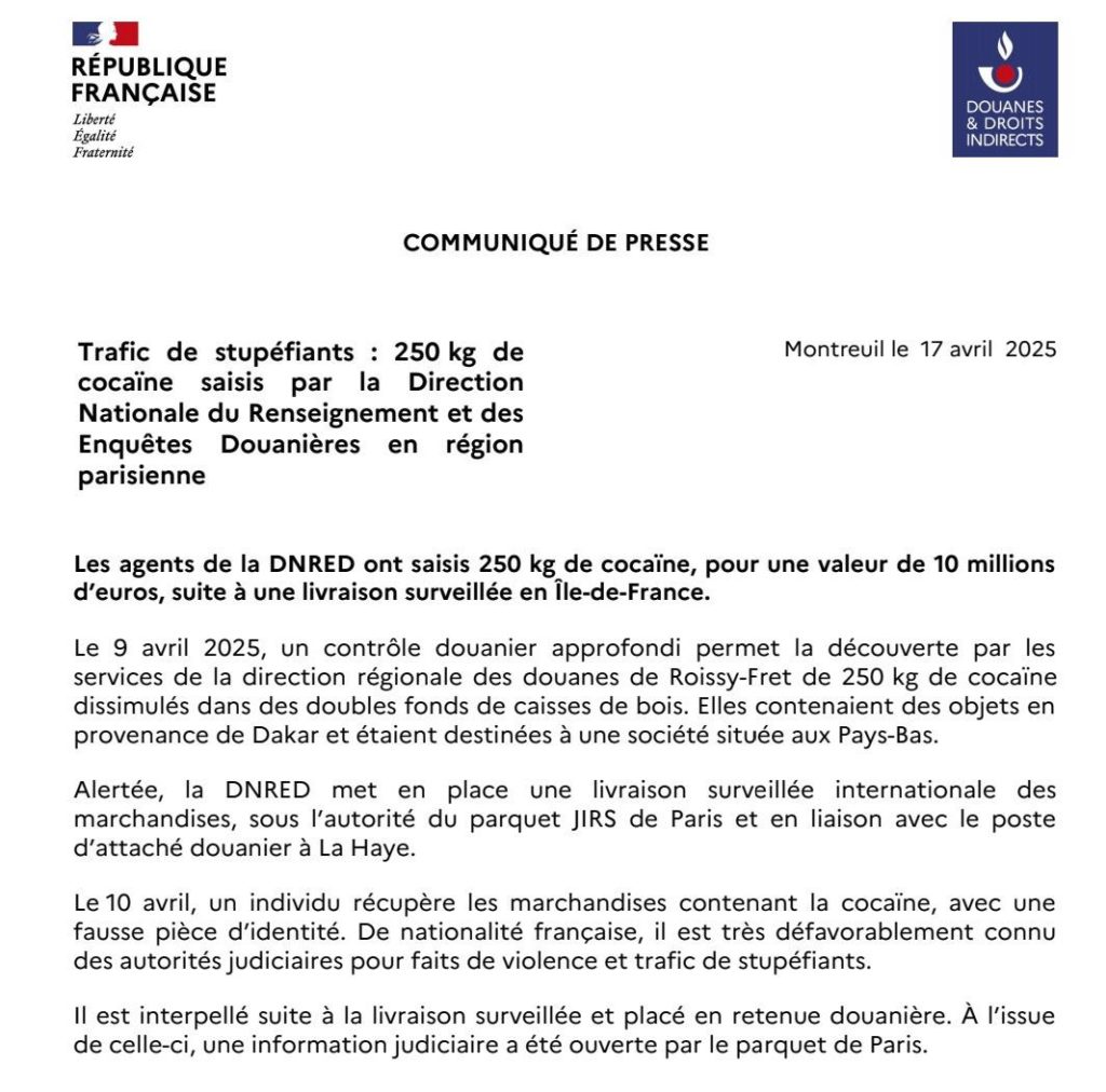 C’est au départ d’un fret expédié depuis Dakar que l’enquête s’est enclenchée. Le 9 avril 2025, les agents de la direction régionale des douanes de Roissy-Fret découvrent la cocaïne (250 kg) dissimulée dans des doubles fonds de caisses en bois. Ces colis, censés transporter des objets, étaient destinés à une société établie aux Pays-Bas.