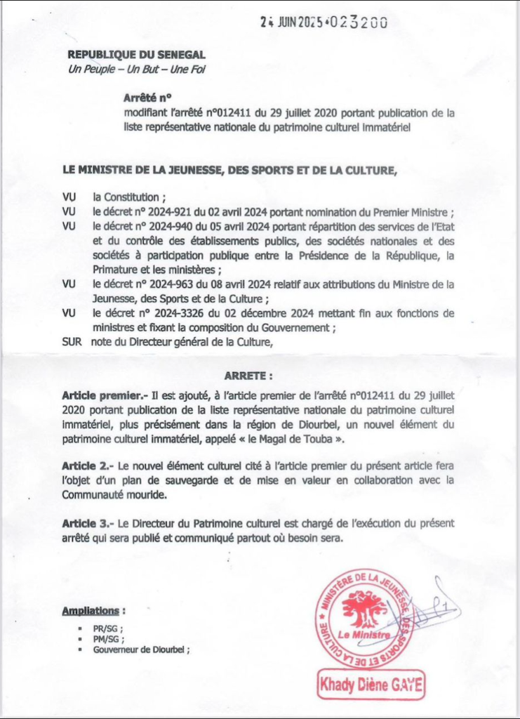 Selon le document officiel : « Il est ajouté, à l’article premier de l’arrêté n°012411 du 29 juillet 2020 portant publication de la liste représentative nationale du patrimoine culturel immatériel, plus précisément dans la région de Diourbel, un nouvel élément du patrimoine culturel immatériel, appelé ‘le Magal de Touba’ ».