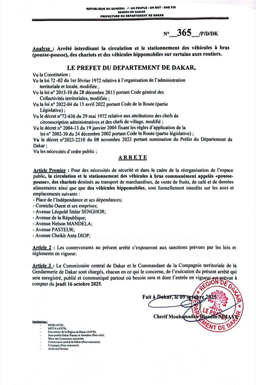 NETTALI.COM - Dans le cadre de la préservation de l’ordre, de la tranquillité et de l’hygiène publics, ainsi que pour assurer la fluidité de la circulation, les préfets des départements de Dakar, Mbour, Kaolack et Saint-Louis ont pris de nouveaux arrêtés interdisant la circulation et le stationnement des chariots de vente de produits alimentaires et de marchandises sur plusieurs axes stratégiques.