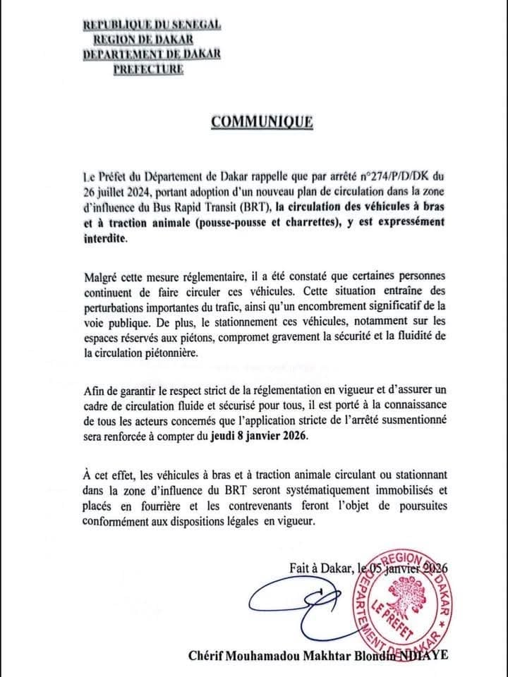 NETTALI.COM - Le préfet de Dakar, Chérif Mouhamadou Makhtar Blondin Ndiaye, a annoncé un renforcement strict des mesures interdisant la circulation des véhicules à bras et à traction animale dans la zone d’influence du Bus Rapid Transit (BRT). Cette décision entrera en vigueur à compter du jeudi 8 janvier 2026.