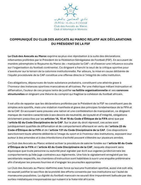 NETTALI.COM - Le Club des Avocats au Maroc a exprimé sa vive réprobation à la suite des déclarations du Président de la Fédération Sénégalaise de Football (FSF), Abdoulaye Fall, accusant le Royaume du Maroc de « manipuler la CAF » et d’exercer une influence occulte sur la gouvernance du football continental.