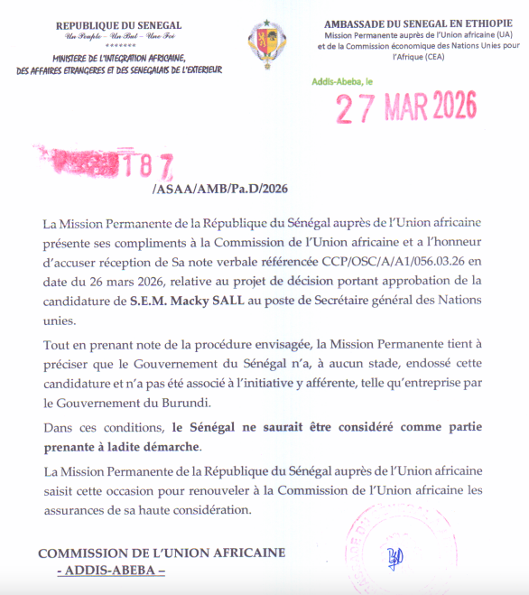 La mission permanente de la République du Sénégal auprès de l’Union africaine a clarifié la position de l’État sénégalais concernant la procédure engagée par l’organisation continentale en faveur de la candidature de l’ancien président Macky Sall au poste de secrétaire général des Nations unies.